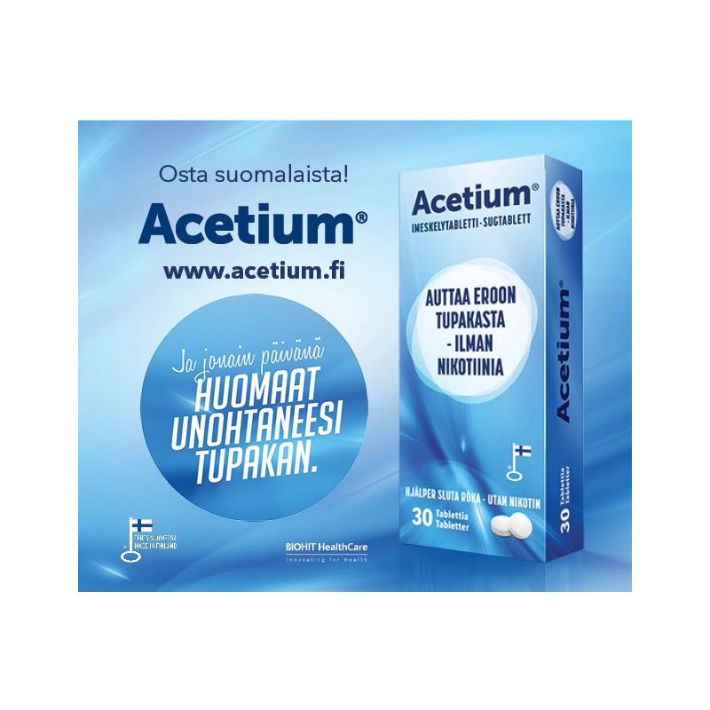 Acetium® imeskelytabletti on nikotiiniton vieroitusvalmiste heille, jotka haluavat lopettaa tupakoinnin. Sen käyttö on helppoa: imeskele yksi tabletti joka kerta, kun tupakoit. Tupakoinnin lopettaminen voi onnistua parhaiten, kun henkilö on siihen motivoitunut, ja se vaatii keskimäärin 3-6 kuukauden säännöllisen käytön. Acetium imeskelytabletilla ei ole perinteisten tupakanvieroitusmenetelmien sivuvaikutuksia (nikotiiniriippuvuus ja lääkkeiden mahdolliset sivuvaikutukset).