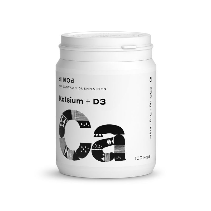 Kalsiumvalmiste, jossa kalsiumkarbonaatti ja kasviperäinen ja aktiivinen D3-vitamiini.