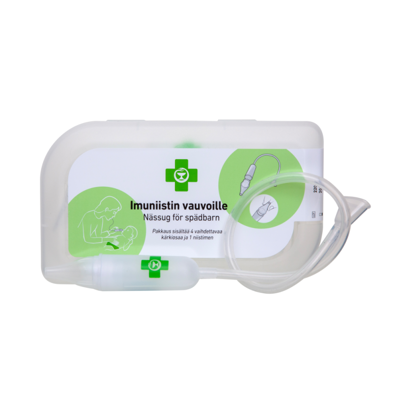 APTEEKKI Imuniistin vauvoille on tarkoitettu imeväisikäisten nenäeritteen poistamiseen turvallisesti, hellävaraisesti ja hygieenisesti imemällä laitteen avulla. Laitteessa on imukykyisen filtterin sisältävä vaihdettava kärkiosa, joka kerää eritteen hygieenisesti