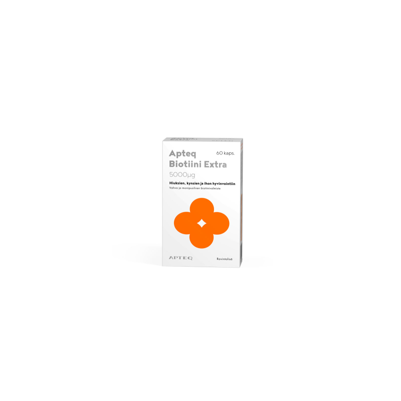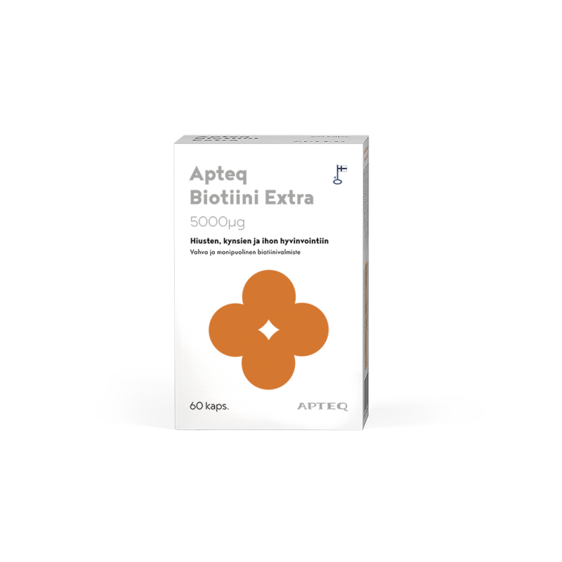 Apteq Biotiini Extra on hiusten, kynsien ja ihon hyvinvointiin suunniteltu vahva ja monipuolinen biotiinivalmiste. Biotiini Extra on Suomessa kehitetty vitamiini-, aminohappo- ja kasvisuuteyhdistelmä.