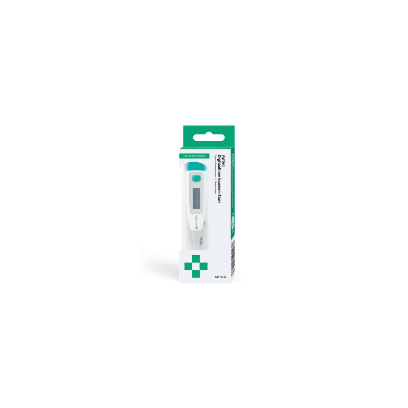 Apteq joustava digitaalinen kuumemittari on luotettava valinta perheen yleiskuumemittariksi. Mittarissa on joustava kärki ja se on vesitiivis.
