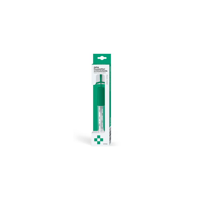 Perinteinen elohopeaton kuumemittari ravistuskotelolla, joka helpottaa osoitinpylvään alasravistamista. Apteq elohopeaton kuumemittari on luotettava ja ympäristöystävällinen vaihtoehto kuumeen mittaamiseen. Elohopeaton kuumemittari toimii kuten perinteinen elohopeakuumemittari, mutta siinä on elohopean tilalla käytetty täysin myrkytöntä galiumpohjaista metalliseosta. Ainutlaatuinen ravistuskotelo helpottaa mittarin käyttämistä.