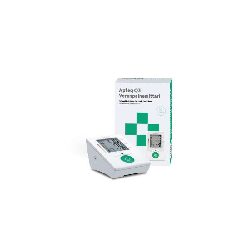 Apteq Q3 on laadukas, tarkka ja luotettava automaattinen olkavarsiverenpainemittari perustoiminnoilla koko perheen käyttöön. Real Fuzzy teknologia mahdollistaa tarkemmat tulokset ilman epämukavaa puristusta. Ilmoittaa mittauksen yhteydessä epäsäännöllisestä sykkeestä ja mittausta häirinneistä kehon liikkeistä. Näyttää verenpainetaudin riskiasteen. Apteq Q3 on kliinisesti validoitu, eli sen tarkkuus on varmistettu puolueettomissa kliinisissä tutkimuksissa. Verenpaineen mittaus on erittäin helppoa ja onnistuu yhdellä napin painalluksella. Tarvittaessa saat haettua edellisten 90 mittauksen tulokset verenpainemittarin muistista.
