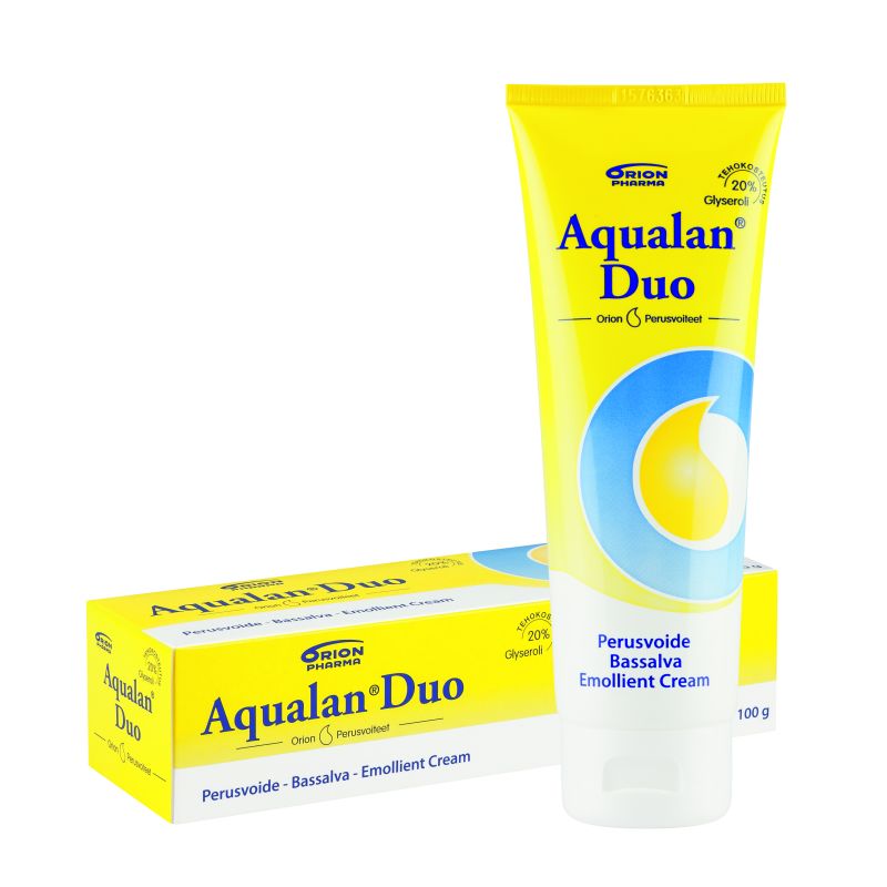 Tehokkaasti kostettava perusvoide Aqualan Duo sopii kuivalle ja kuivan tuntuiselle iholle. Kosteuttavaa ominaisuutta vahvistaa suuri glyserolimäärä. Hajustamaton tuote ei allergisoi.