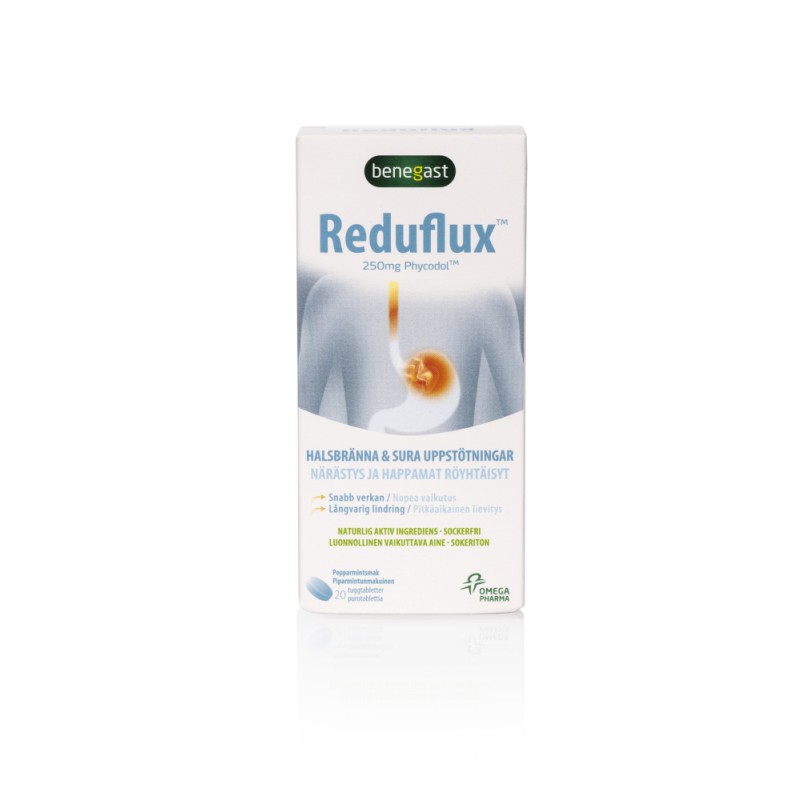 Happoja neuraloivat suolat ja vatsan limakalvoja suojaava alginaatti närästykseen ja happamiin röyhtäisyihin. Reduflux tuo nopean avun happovaivoihin ja vaikutus kestää neljän tunnin ajan. Purutableteissa on makuna viilentävä piparminttu. Alumiiniton ja sokeriton. Sopii raskaana oleville ja imettäville.