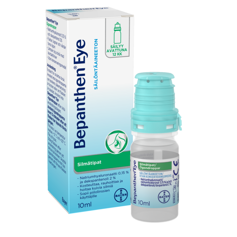 Bepanthen Eye Silmätipat muodostavat silmän sarveiskalvolle tasaisen, kirkkaan ja pitkäkestoisen suojakalvon. Tipat eivät sumenna näköä sekä sopivat käytettäväksi yhdessä piilolinssien kanssa.