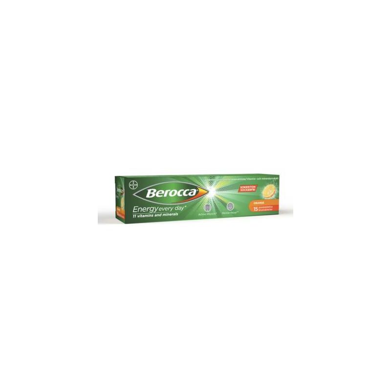 Berocca Energy tukee aivojen toimintaa 3) ja auttaa sinua pysymään hyvässä vireessä joka päivä 1). Poretabletit liukenevat nopeasti veteen ja sisältävät 11 välttämätöntä vitamiinia ja kivennäisainetta, mukaan lukien useita B-vitamiineja: B1- ja B2-vitamiinit auttavat vapauttamaan energiaa ruoasta, B3- ja B6-vitamiinit vähentävät väsymystä ja B5-vitamiini tukee henkistä suorituskykyä. Magnesiumin avulla taistelet väsymystä vastaan ja magnesium tasapainottaa elektrolyyttejä. C-vitamiini vahvistaa immuunijärjestelmää. Yksi sokeriton, appelsiinin makuinen poretabletti auttaa vapauttamaan luonnollista energiaa 2), jotta pysyt hyvässä vireessä joka päivä 1). Liuota yksi tabletti vesilasilliseen ja nauti hyvänmakuisesta juomasta. Berocca Energy soveltuu aikuisille ja vähintään 12-vuotiaille sekä vegaaneille. Berocca Energy ei sisällä kofeiinia ja se on gluteeniton.