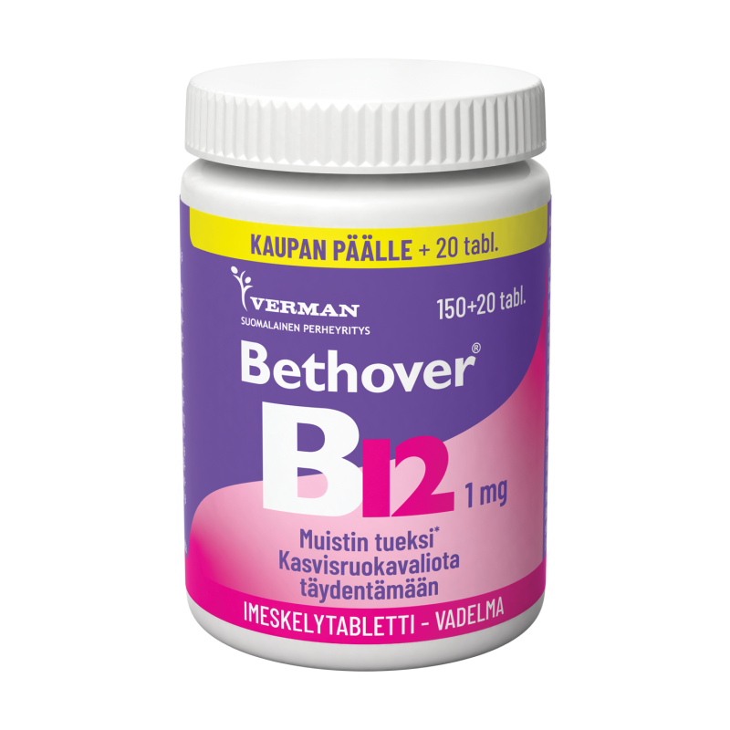 B12-vitamiini imeskelytablettina muistin ja jaksamisen tueksi. B12-vitamiini on tärkeä vitamiinilisä mm. ikääntyville ja kasvissyöjille.