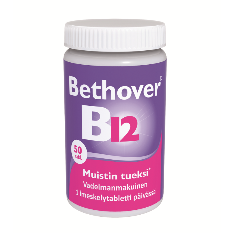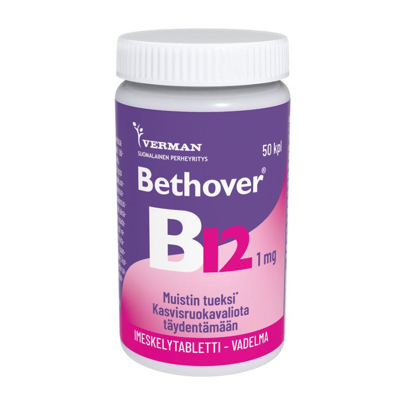 B12-vitamiini imeskelytablettina muistin ja jaksamisen tueksi. B12-vitamiini on tärkeä vitamiinilisä mm. ikääntyville ja kasvissyöjille. Ei sisällä eläinperäisiä ainesosia, sopii vegaaneille. Tuote on laktoositon, maidoton gluteiiniton ja sokeriton.