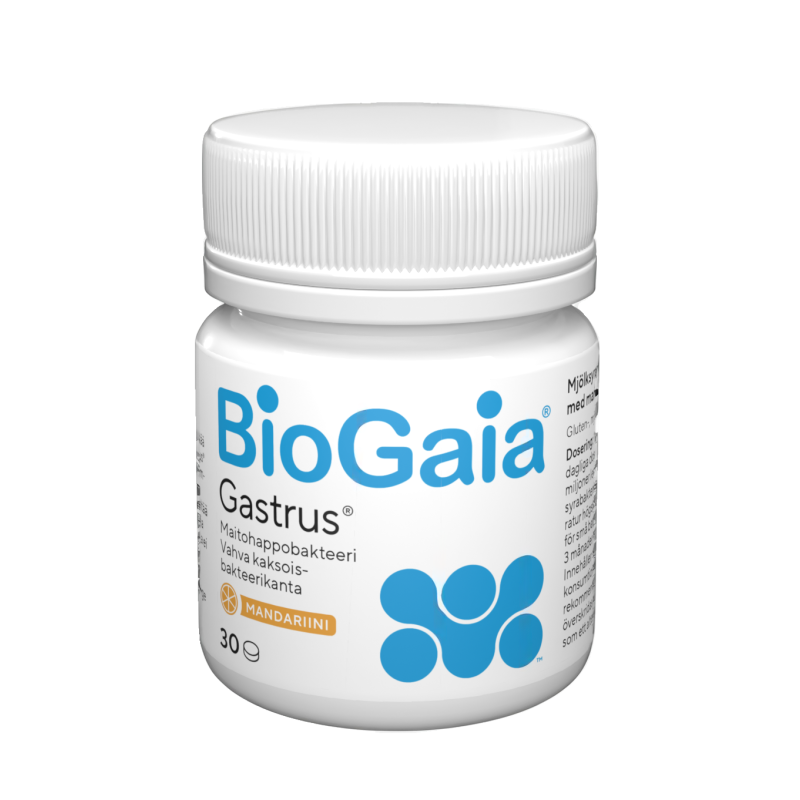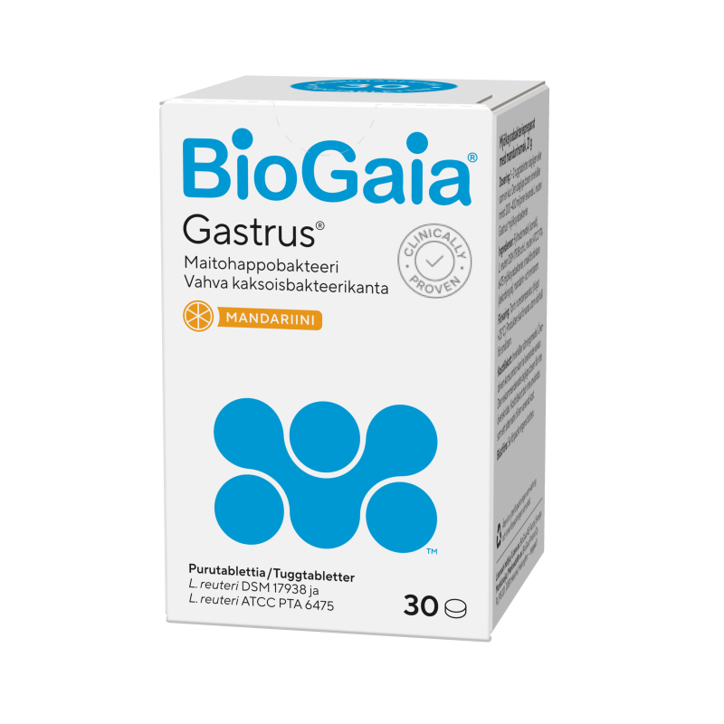 BioGaia Gastrus -maitohappobakteerivalmiste on vahva, kahden ihmiselle luontaisen Lactobacillus reuteri -maitohappobakteerikannan yhdistelmä. Se sisältää patentoitua Lactobacillus reuteri Gastrus® (L. reuteri DSM 17938 ja L. reuteri ATCC PTA 6475*) -maitohappobakteerikantaa. L. reuteri Gastrus on kliinisesti tutkittu. Annostus 1-2 purutablettia päivässä. Mandariininmakuinen. Gluteeniton, maidoton, ja laktoositon. Sopii vegaaneille. Ravintolisä.