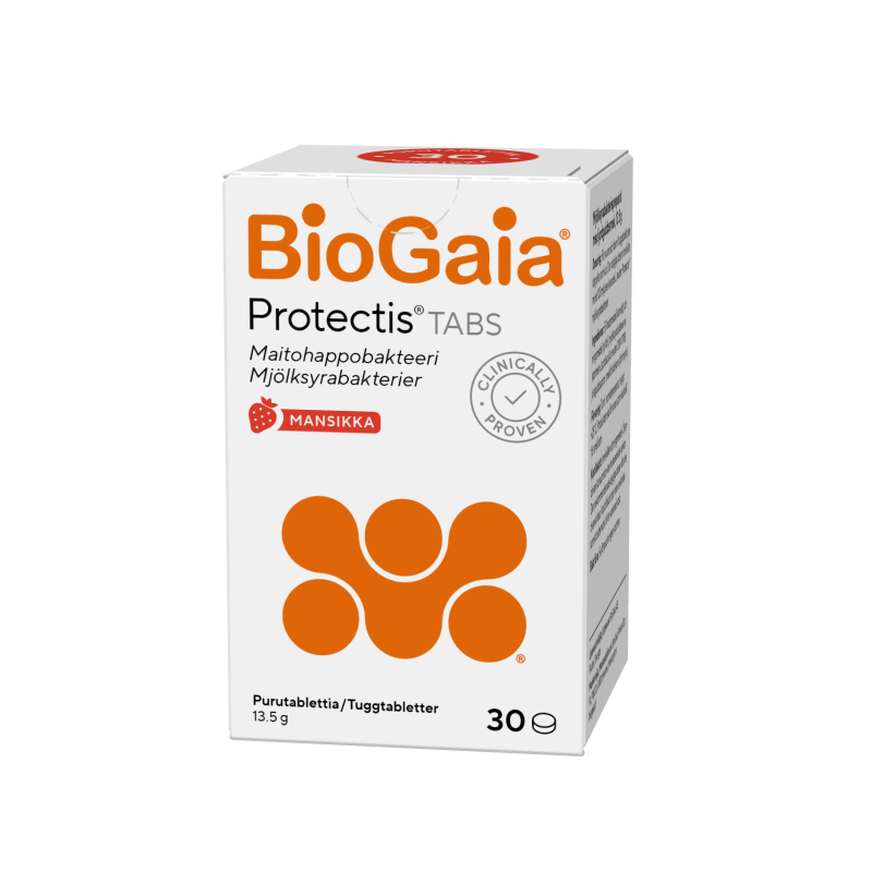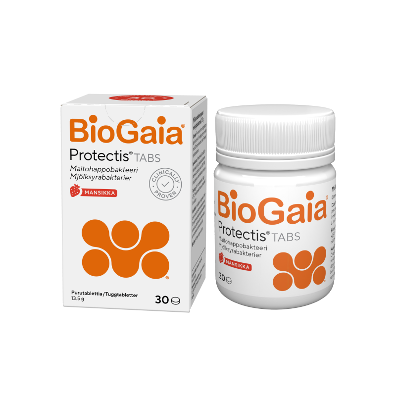 BioGaia Tabs on maitohappobakteerivalmiste, joka sisältää tutkittua ja patentoitua Lactobacillus reuteri Protectis® (L. reuteri DSM 17938) -maitohappobakteerikantaa, josta on tehty yli 200 kliinistä tutkimusta. Mansikanmakuiset purutabletit sopivat kaikenikäisille joko päivittäiseen käyttöön tai kuurina. Annostus on 1 purutabletti päivässä. Maidoton, gluteeniton, laktoositon. Ei sisällä eläinperäisiä aineita. Ravintolisä.