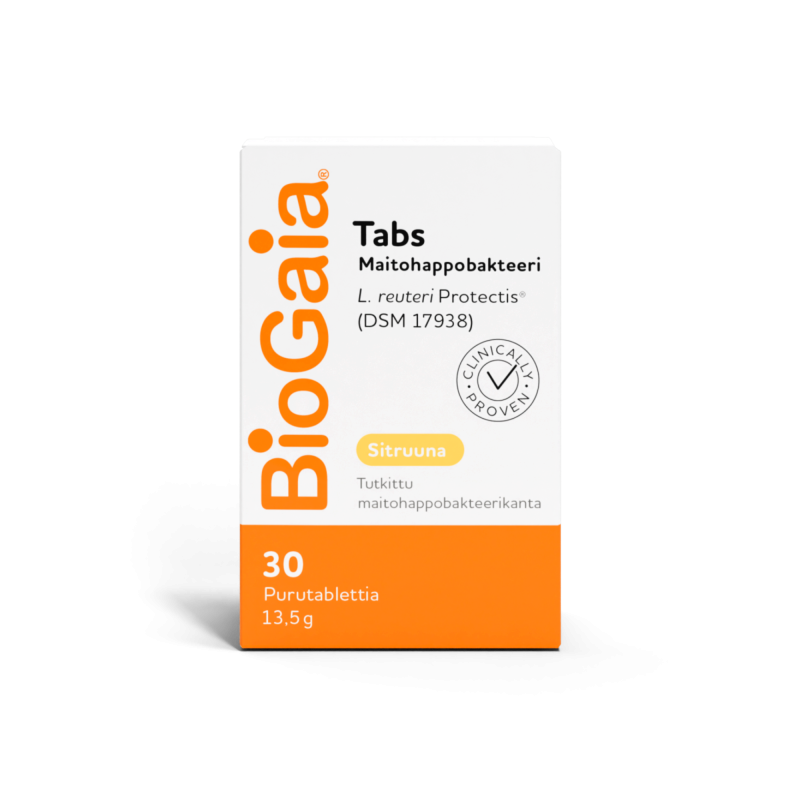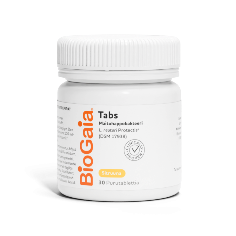 BioGaia Tabs on maitohappobakteerivalmiste, joka sisältää alkuperäistä, tutkittua ja patentoitua Lactobacillus reuteri Protectis® (L. reuteri DSM 17938) -maitohappobakteerikantaa, josta on tehty yli 200 kliinistä tutkimusta. Raikkaan sitruunanmakuiset purutabletit sopivat kaikenikäisille joko päivittäiseen käyttöön tai kuurina. Annostus on 1 purutabletti päivässä. Maidoton, gluteeniton, laktoositon ja hiivaton. Ei sisällä eläinperäisiä aineita. Ravintolisä.