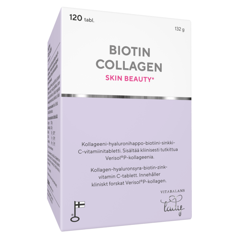 Biotin Collagen Skin Beauty sisältää kliinisesti tutkittua Verisol® P-kollageenia. Verisol® P-kollageeni on tyypin I kollageenia, joka on imeytymisen tehostamiseksi pilkottu pienemmiksi kollageenipeptideiksi. Kollageenin lisäksi tuotteessa on hyaluronihappoa, sinkkiä, biotiinia ja C-vitamiinia. C-vitamiini edistää ihon omaa kollageenin muodostusta. Biotiini ja sinkki edistävät ihon pysymistä normaalina.