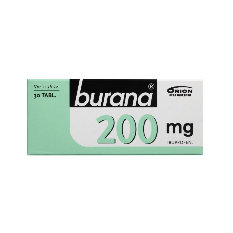 Burana 200 mg tilapäisiin kipu- ja kuumetiloihin. Vaikuttava aine ibuprofeeni. Ei tule antaa alle 10 kg lapselle.