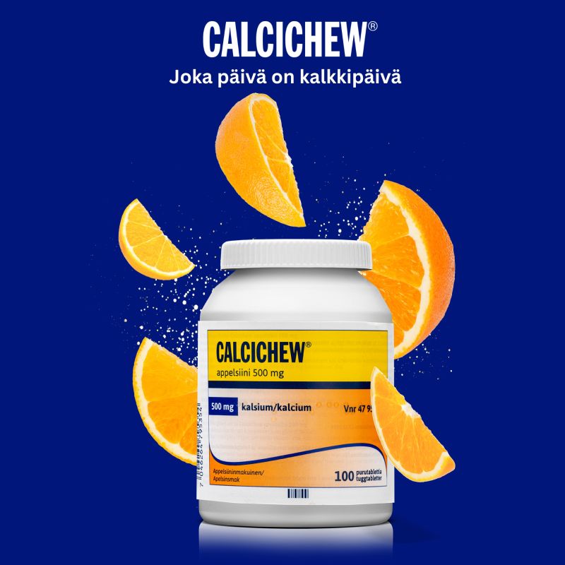 Calcichew appelsiini 500 mg -purutabletit sisältävät kalsiumia, joka on luun muodostuksen kannalta tärkeä aine. Niitä käytetään kalsiumin puutteen hoitoon ja ehkäisyyn sekä osteoporoosihoidon tukena. Lääkärin määräämänä voidaan käyttää myös fosfaatin sitojana, jos veressä on runsaasti fosfaattia. Yksi Calcichew-purutabletti sisältää 500 mg kalsiumia.
