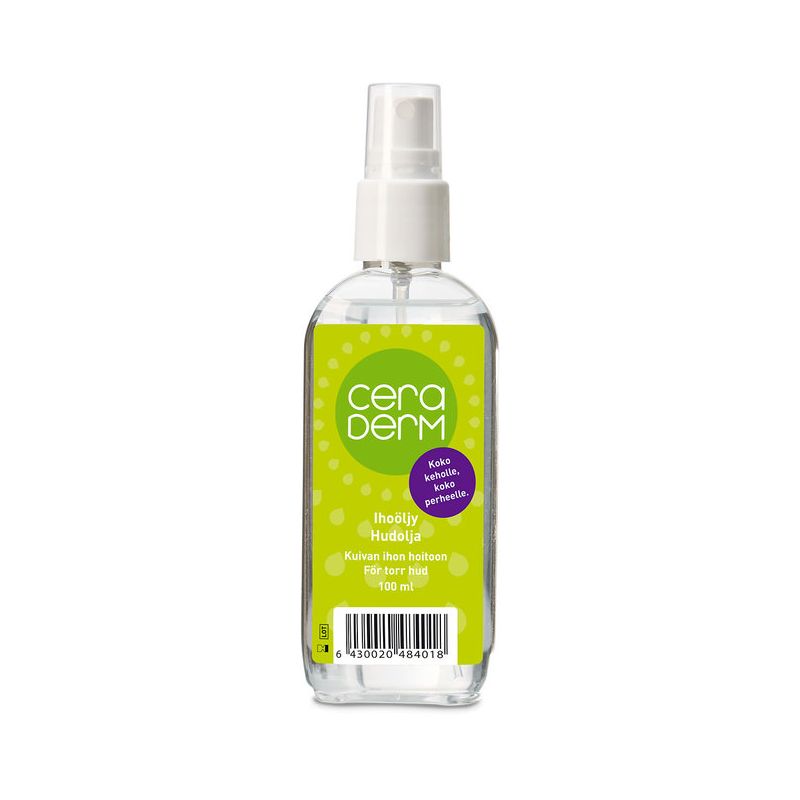 Ceraderm Ihoöljy ylläpitää ihon luonnollista kosteustasapainoa vahvistamalla ihon omaa suojaa ja ehkäisemällä kosteuden liiallista haihtumista. Ei sisällä vettä, hajusteita, emulgaattoreita, säilöntä- tai väriaineita.