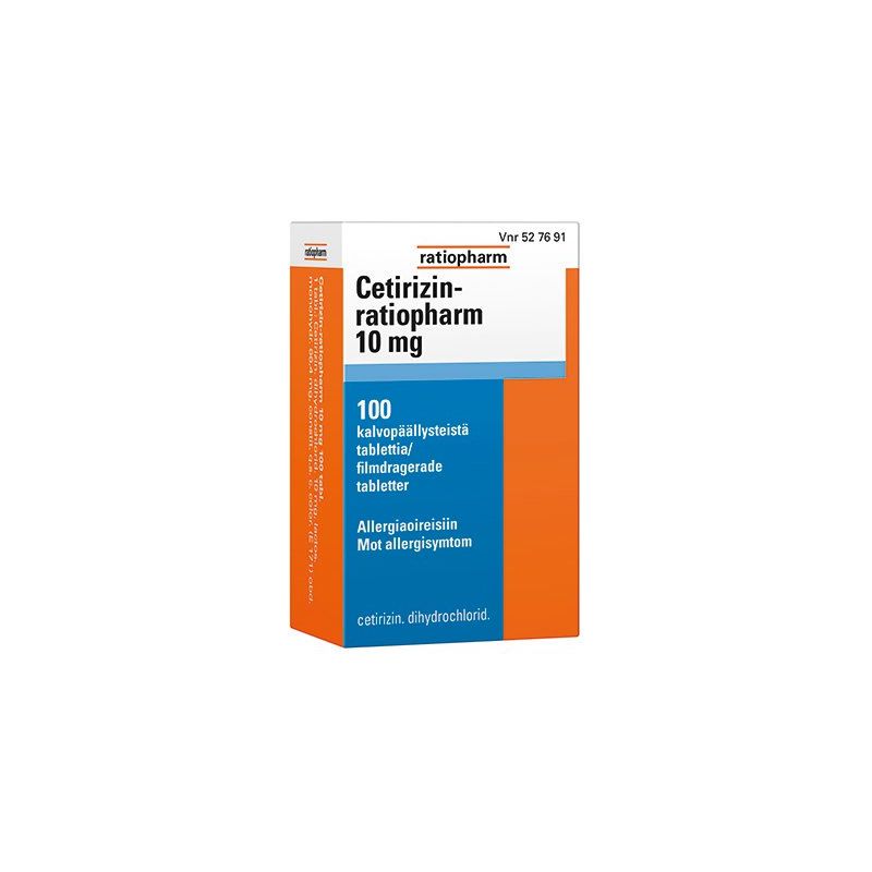 Cetirizin-ratiopharm 10 mg on allergialääke, joka on tarkoitettu kausiluonteiseen ja ympärivuotiseen allergiseen nuhaan liittyvien nenä- ja silmäoireiden sekä nokkosihottuman hoitoon. Sen vaikuttava aine setiritsiini on antihistamiini. Pakkauskoot: 10, 30 ja 100 kalvopäällysteistä tablettia. Tutustu huolella pakkausselosteeseen. Itsehoitolääke.