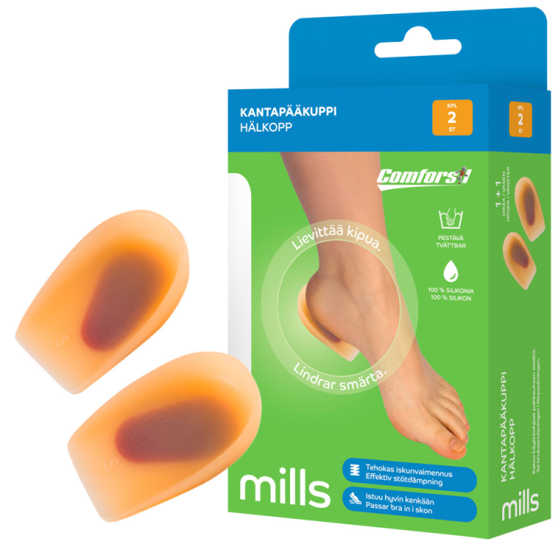 Lievittää kantapääkipua, joka johtuu esim. väsyneistä jaloista, ohentuneesta tai siirtyneestä rasvapatjasta tai kantakalvon tulehduksesta (plantaarifaskiitti). Tuote soveltuu myös luupiikin ja kantapään limapussintulehduksen hoitoon. Kantapääkupin korotetut reunat tukevat kantapään pehmytkudoksia ja pitävät rasvapatjan paikoillaan. Tuotteen keskellä on erikoispehmeä silikonityyny, joka vähentää kantaluuhun kohdistuvaa kuormitusta.