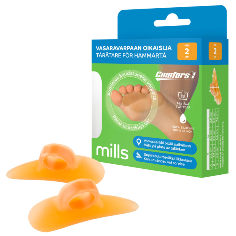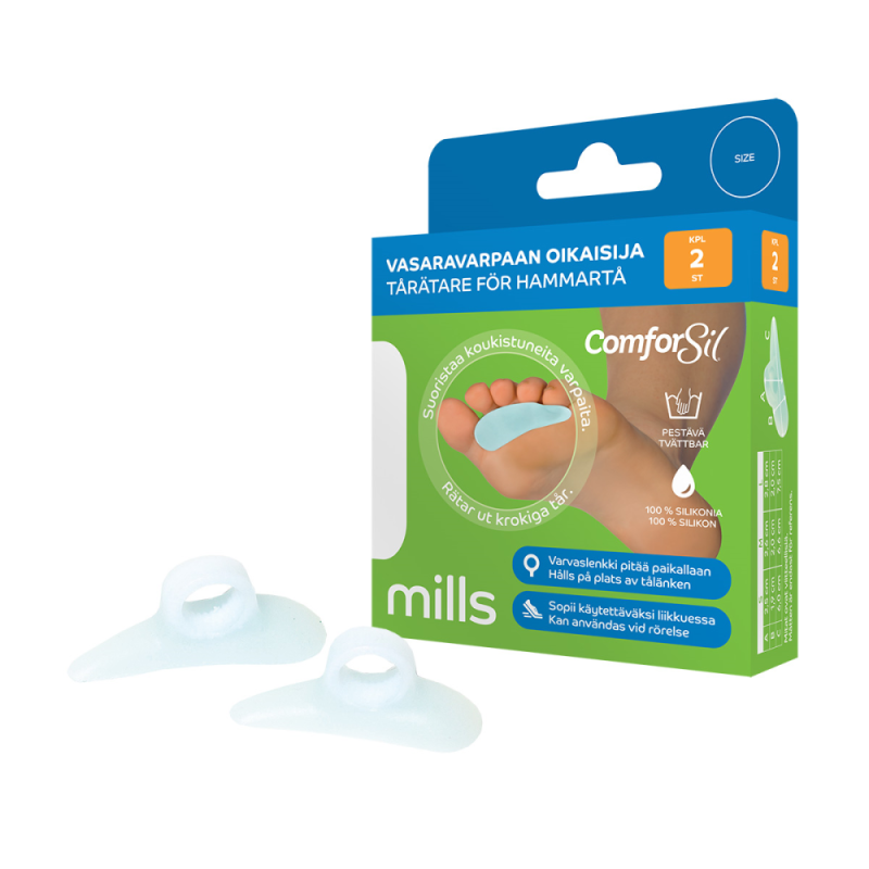 Suoristaa koukussa olevien varpaiden asentoa oikeaan asentoon. Vähentää painetta varpaiden päissä ja venyttää varpaiden alapuolista jännettä. Lievittää kipua myös jäykistyneissä varpaissa. Tuotteen yhteydessä suositellaan talkin käyttöä.