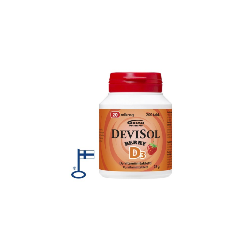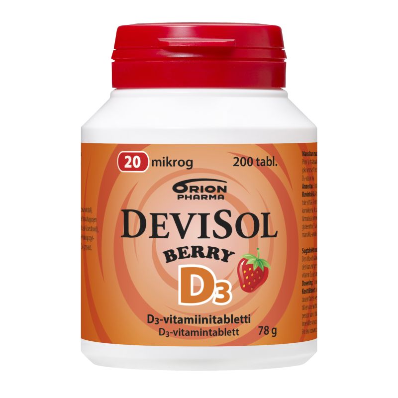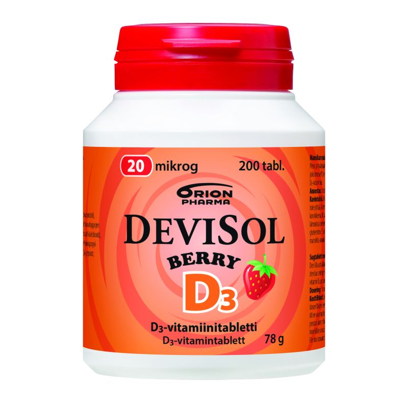 DeviSol Berry on aidon mansikan makuinen imeskeltävä tai pureskeltava D-vitamiinitabletti. Hyvän maun salaisuus on luontainen mansikka-aromi. Tabletit on makeutettu ksylitolilla ja sorbitolilla ja sisältävät vain luonnollista aromiainetta. Laktoositon (maidoton), gluteeniton, hiivaton ja sokeriton. Ei sisällä soijaa eikä liivatetta.