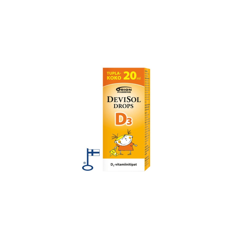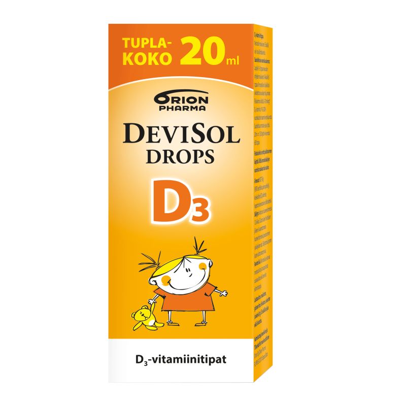 DeviSol Drops on D3-vitamiinia sisältävä öljypohjainen tippavalmiste, joka soveltuu päivittäisen D-vitamiinin saannin varmistamiseen vauvaiästä lähtien. Helppo annostella lusikalla tai sekoittaa ruokaan tai juomaan. Täysin makuaineettomat DeviSol-tipat voi sekoittaa joko kuumaan tai kylmään ruokaan tai juomaan. Ei sisällä säilöntä-, väri- tai aromiaineita. Säilyy huoneenlämmössä myös avaamisen jälkeen. Suositeltu päiväannos on 1-5 tippaa eli 2-10 mikrogrammaa.