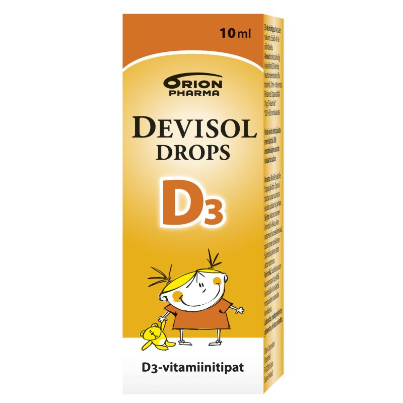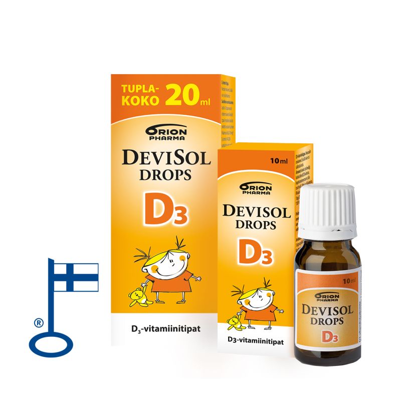 DeviSol Drops on D3-vitamiinia sisältävä öljypohjainen tippavalmiste, joka soveltuu päivittäisen D-vitamiinin saannin varmistamiseen vauvaiästä lähtien. Helppo annostella lusikalla tai sekoittaa ruokaan tai juomaan. Täysin makuaineettomat DeviSol-tipat voi sekoittaa joko kuumaan tai kylmään ruokaan tai juomaan. Ei sisällä säilöntä-, väri- tai aromiaineita. Säilyy huoneenlämmössä myös avaamisen jälkeen. Suositeltu päiväannos on 1-5 tippaa eli 2-10 mikrogrammaa.