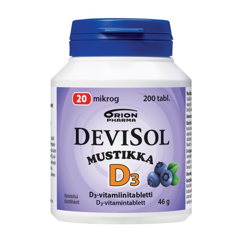 Devisol Mustikka 20 mikrog on aidon mustikan makuinen D-vitamiini puru-/imeskelytabletti. Makeutettu ksylitolilla ja sorbitolilla. Sisältää hyvin imeytyvää D3-vitamiinia. Saatavilla 200 tabl. pakkauksissa.