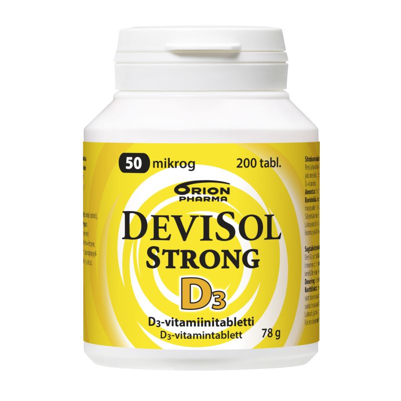 Raikkaasti sitrukselta maistuva DeviSol Strong sisältää 50 mikrogrammaa hyvin imeytyvää D3-vitamiinia. 50 mikrogramman vahvuus sopii erityisesti todetun matalan D-vitamiinitason nostoon sekä harvempaa annostusta suosiville. Makeutettu ksylitolilla ja sorbitolilla ja sisältää vain luonnollista sitrusaromia. Helposti suussa hajoavan tabletin voi joko imeskellä, pureskella tai antaa hitaasti liueta suussa. Laktoositon (maidoton), gluteeniton, hiivaton, sokeriton. Ei sisällä soijaa tai liivatetta.