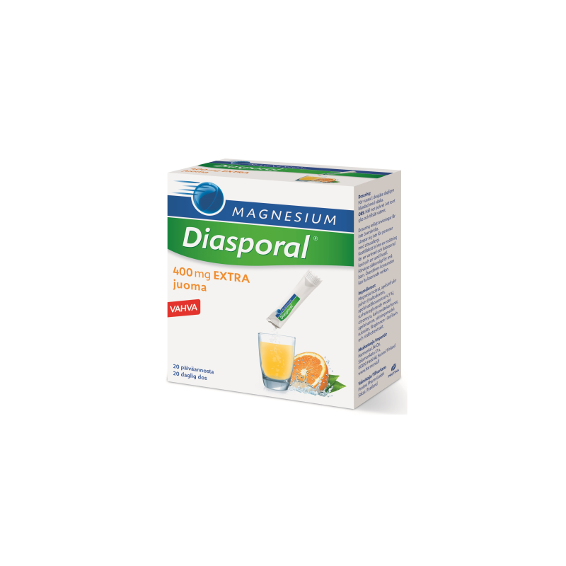 Vahva appelsiinin makuinen Diasporal® 400 mg EXTRA -juomajauhe sisältää magnesiumsitraattia, joka auttaa edistämään lihaksiston normaalia toimintaa. Yksi annos sisältää 400 mg magnesiumia. Nestemäisessä valmisteessa magnesiumionit ovat valmiiksi vapaina ja magnesium pääsee imeytymään poikkeuksellisen nopeasti. Sopii tavallista suurempaan magnesiumin tarpeeseen, esim. lihaskramppeihin, suonenvetoihin, urheilijoille, tai voimakkaan hikoilun jälkeen. Sokeriton. Yksi annos päivässä riittää.