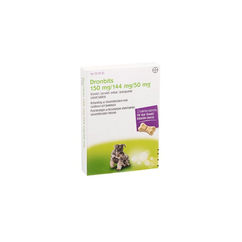 Lihanmakuinen Dronbits 150 mg/144 mg/50 mg tabletti on pienille koirille tarkoitettu sisäloislääke, joka tehoaa kerta-annoksena pyörö- ja heisimatoihin. Dronbitsin vaikuttavat aineet ovat pratsikvanteeli, pyranteeli ja febanteeli. Ei alle 2 kg painaville koirille.