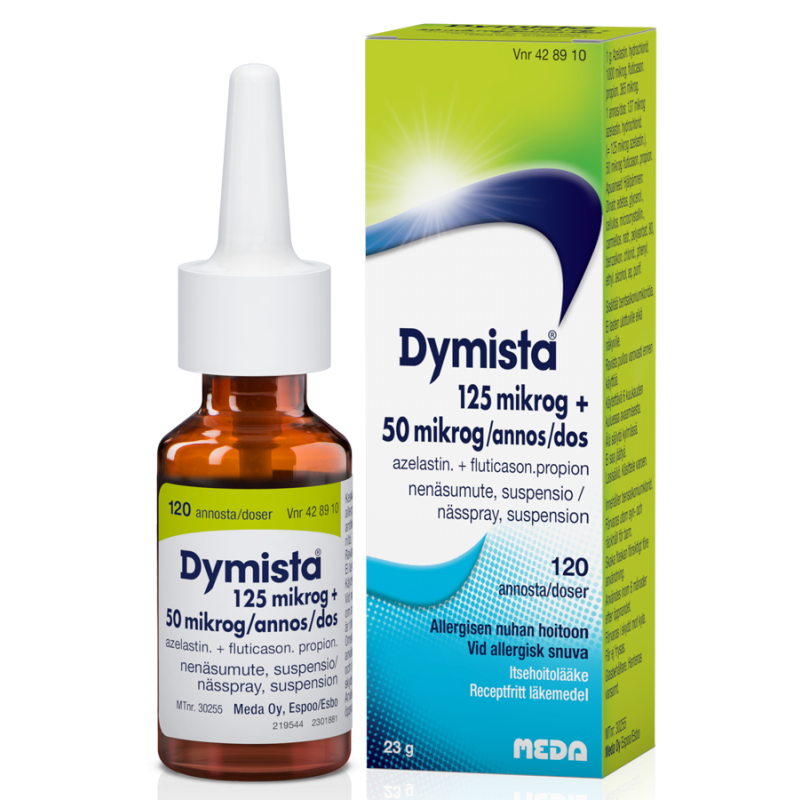 Dymistaa käytetään vähintään 18-vuotiaille aikuisille keskivaikean tai vaikean kausiluonteisen allergisen nuhan oireiden lievittämiseen. Dymista lievittää allergisia oireita kuten nuhaa, limaisuutta, aivastelua, nenän kutinaa ja tukkoisuutta. Dymistan vaikuttavat aineet ovat atselastiini ja flutikasonipropionaatti. Pitkäaikaiseen käyttöön ja alle 18-vuotiaille vain lääkärin ohjeen mukaan.