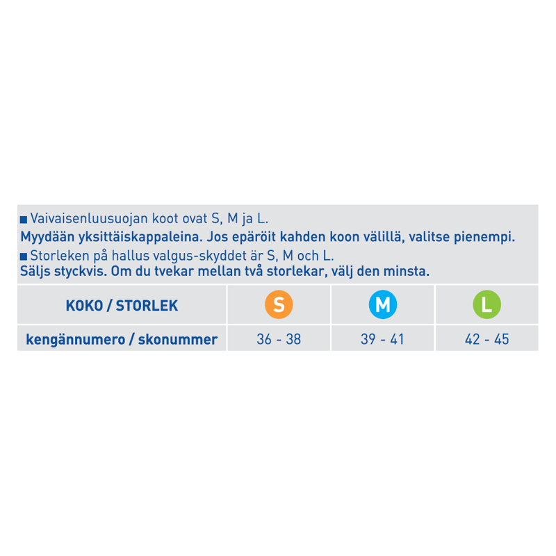 - Vaivaisenluun suoja ehkäisee liialliseen paineeseen ja hankaukseen liittyvää vaivaisenluun (hallux valgus) aiheuttamaa kipua.