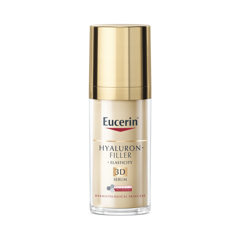 Eucerinin Hyaluron-Filler + Elasticity 3D Serum on kevyt ja kosteuttava ikääntymisen merkkejä ehkäisevä hoitoseerumi, joka on kehitetty dermatologisten hoitojen inspiroimana. Se hoitaa tehokkaasti kaikkia kolmea ihon ikääntymisen merkkiä: