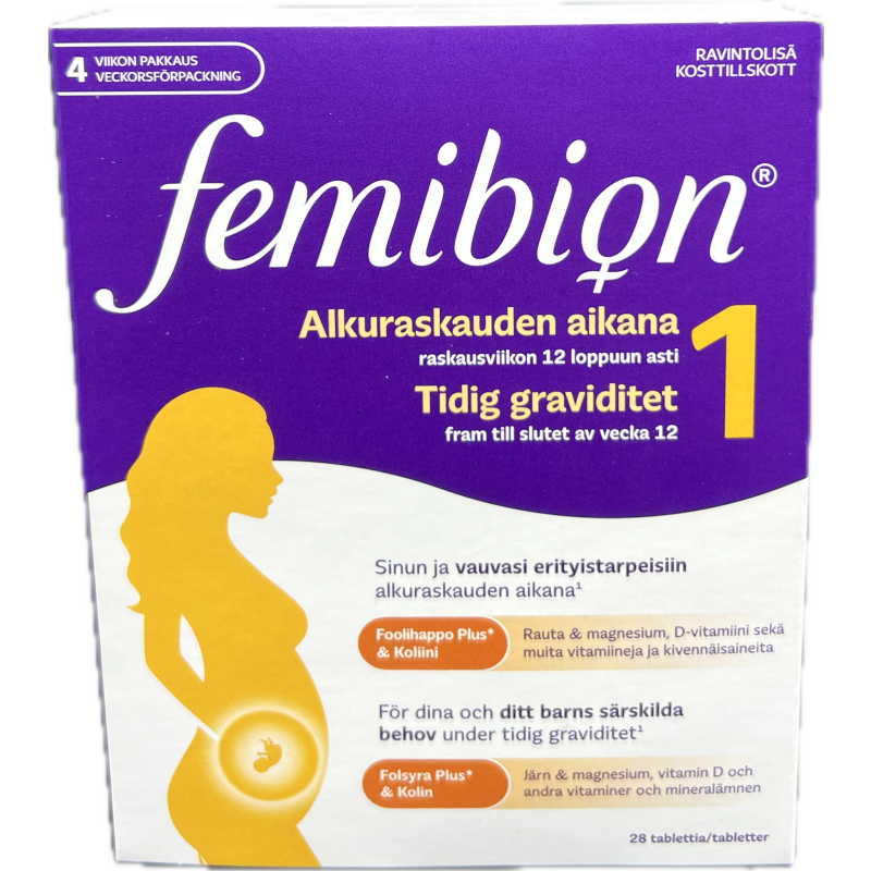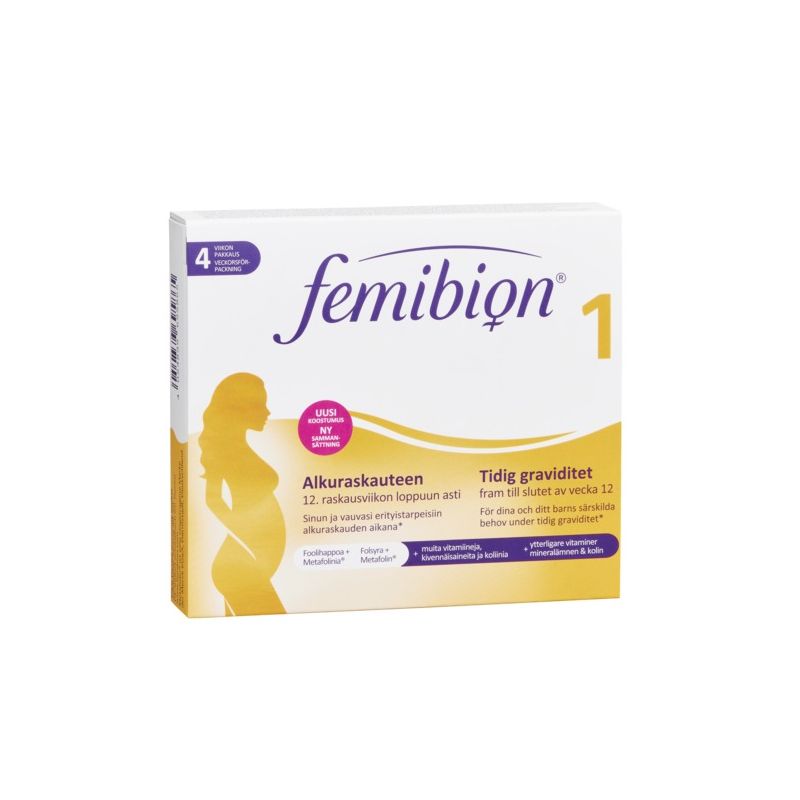 1 tabletti päivässä ruokailun yhteydessä. Käytä raskauden suunnitteluvaiheessa ja jatka 12. raskausviikon loppuun saakka. Tämän jälkeen suositellaan siirtymään Femibion raskaus 2 -valmisteeseen.