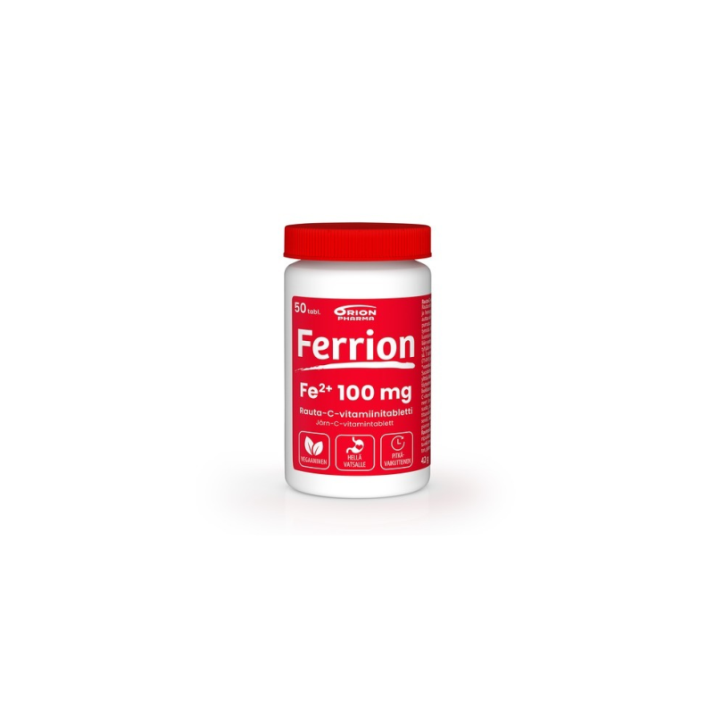 Ferrion 100 mg on vahva, pitkävaikutteinen rauta -ja C-vitamiinivalmiste, jossa rauta on vatsaystävällisessä bisglysinaattimuodossa. Ferrion sisältää 100mg rautaa ja 60 mg raudan imeytymistä tehostavaa C-vitamiinia. Pitkävaikutteisesta tabletista rauta vapautuu vasta ohutsuolessa, mistä se parhaiten imeytyy elimistön käyttöön. Valmisteen voi halutessaan nauttia myös ruokailun yhteydessä*, mikä voi auttaa vähentämään mahdollista vatsaärsytystä. Pienikokoisen, helposti nieltävän tabletin voi tarvittaessa puolittaa. Sopii myös vegaaneille. Ravintolisä.
