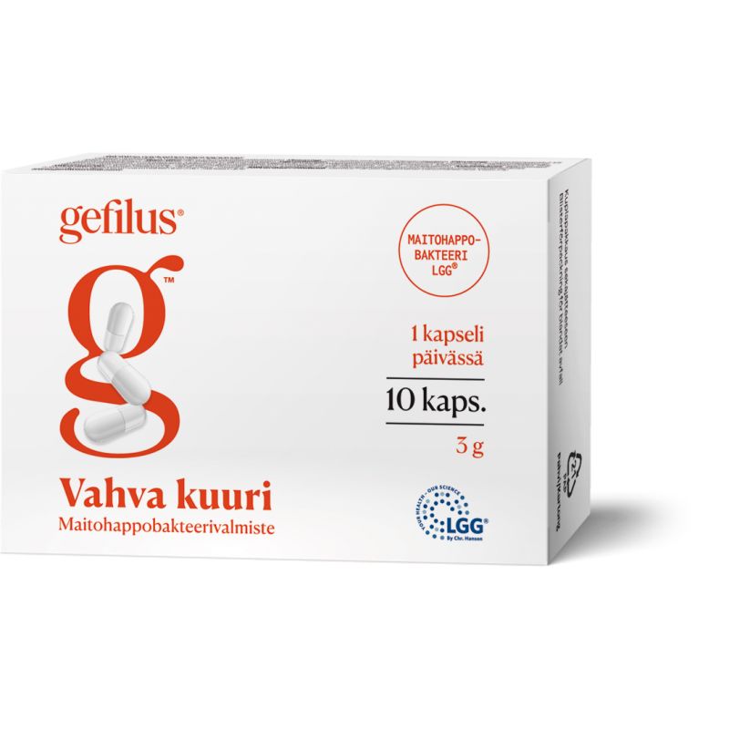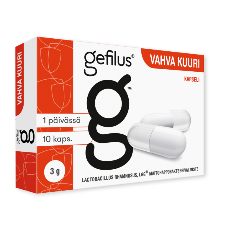 Gefilus VAHVA Kuuri maitohappobakteerikapselit sisältävät 10 miljardia maailman tutkituinta Lactobacillus rhamnosus GG -maitohappobakteeria.