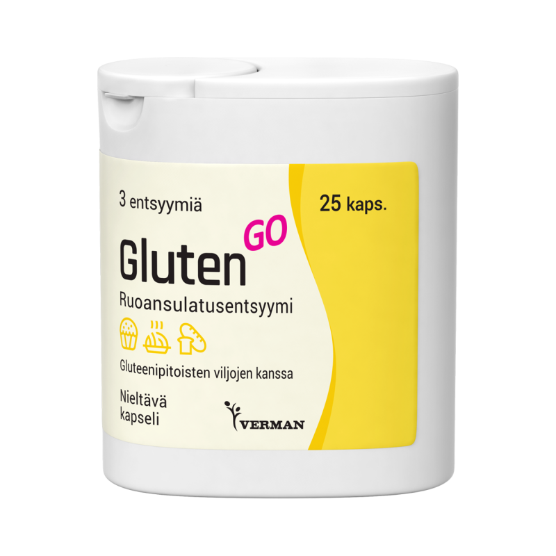 Monet välttävät gluteenipitoisia viljoja. Joskus syynä on keliakia, ja silloin hoitona on tiukka gluteeniton dieetti. Gluteenia voidaan välttää myös muista syistä, esimerkiksi gluteeniherkkyyden takia. Gluten GO on pieni, helposti nieltävä kapseli kätevässä taskupakkauksessa. Se sopii erityisesti gluteeniherkille. Tuote ei korvaa keliaakikon gluteenitonta ruokavaliota. Kapseli nautitaan aterian yhteydessä. Käytetään viljoja sisältävien ruokien yhteydessä. Pilkkoo myös maidon proteiinia.
