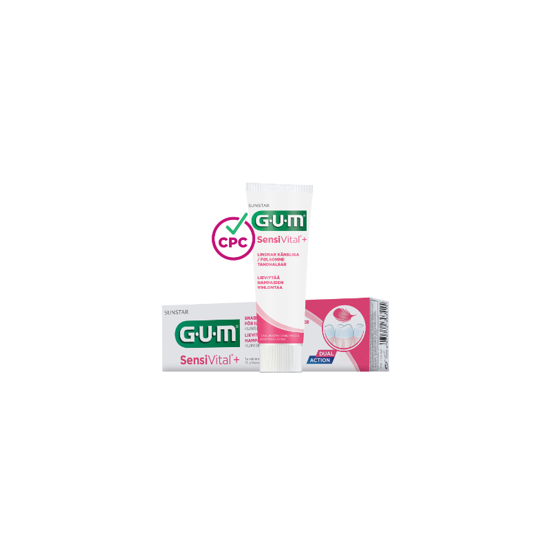 GUM® SensiVital®+ hammastahna tarjoaa nopean ja pitkäkestoisen suojan vihlontaa vastaan vahvistamalla hampaiden kiillettä, suojaamalla kiilteen alla olevaa pehmeämpää hammasluuta ja rauhoittamalla sen hermopäitä. Hellävarainen hammastahna sopii aikuisille ja yli 7-vuotiaille lapsille päivittäiseen käyttöön.