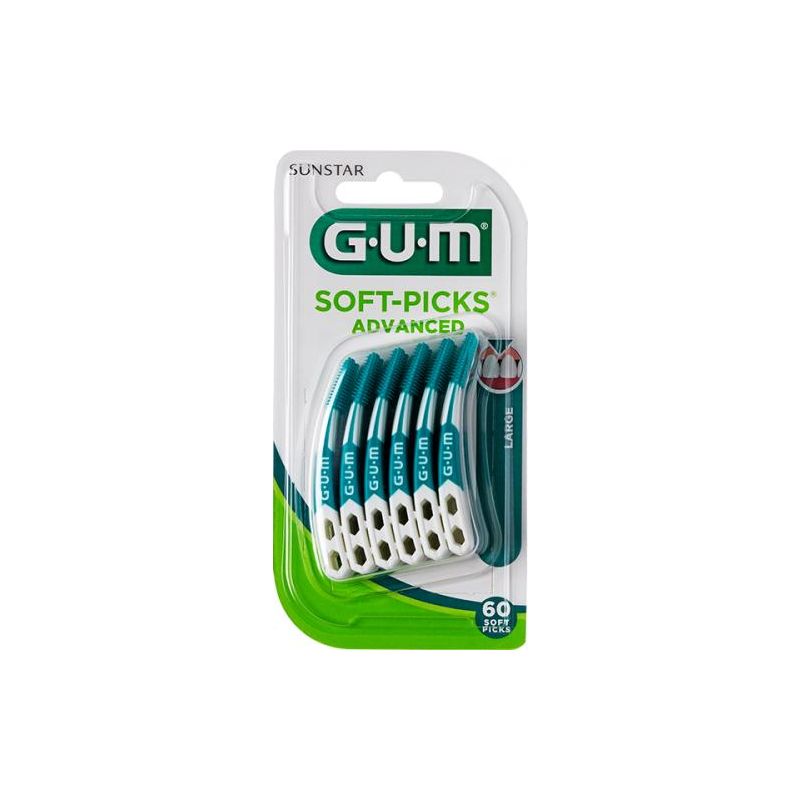 GUM Soft-Picks Advanced ergonominen, kaareva muotoilu helpottaa takahampaiden välien puhdistusta ja sen pitkästä varresta saa tukevan otteen. Sopii hyvin pienemmille hammasväleille ja voidaan käyttää myös oikomiskojeiden, hammassiltojen ja hammasimplanttien kanssa.