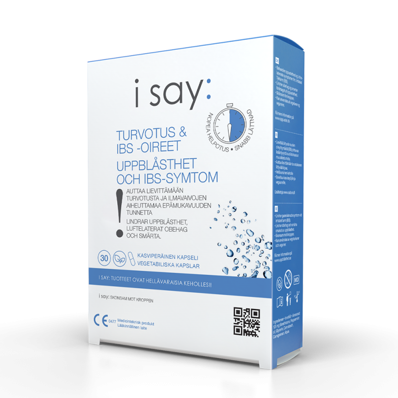 i say: TURVOTUS & IBS-OIREET kapselit lievittävät turvotuksesta aiheutuvaa kipua ja varmistavat, että ruuansulatuskanavaan jäänyt ilma poistuu nopeasti.