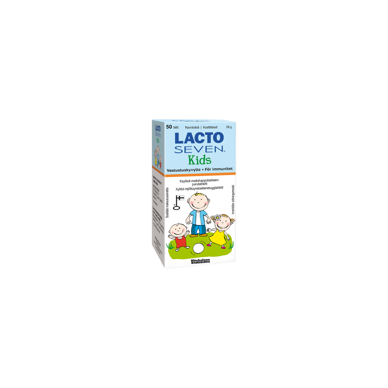 Lacto Seven Kids sisältää seitsemää erilaista kylmäkuivattua, luonnollista maitohappobakteerikantaa sekä D-vitamiinia, joka edistää vastustuskyvyn normaalia toimintaa. Yhdessä tabletissa on yhteensä miljardi elävää maitohappobakteeria. Valmisteen bakteereilla on erityinen Bio-Support™-suojaus, jonka ansiosta bakteerit säilyvät elävinä ja toimintakykyisinä aina suolistoon saakka. Mansikan ja vadelman makuinen purutabletti on makeutettu hammasystävällisellä ksylitolilla.