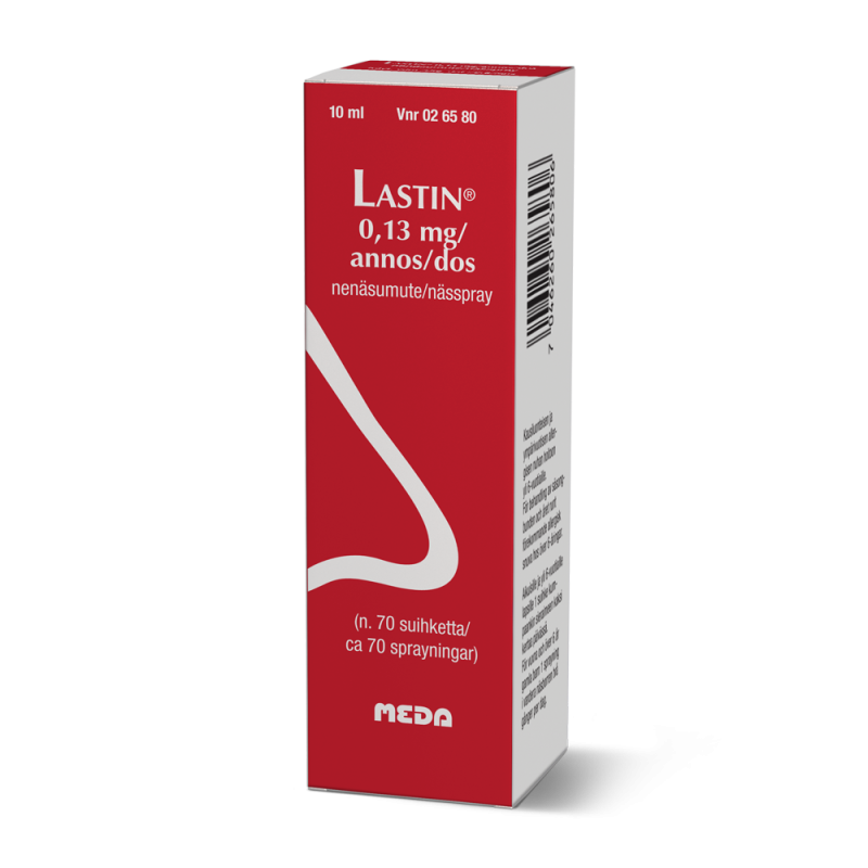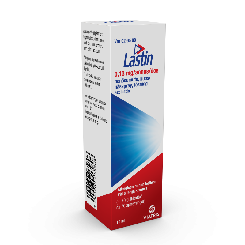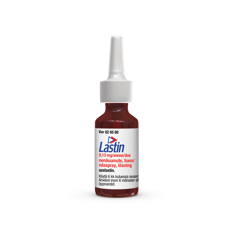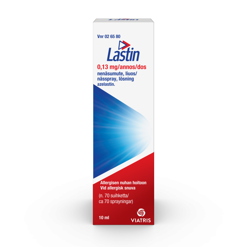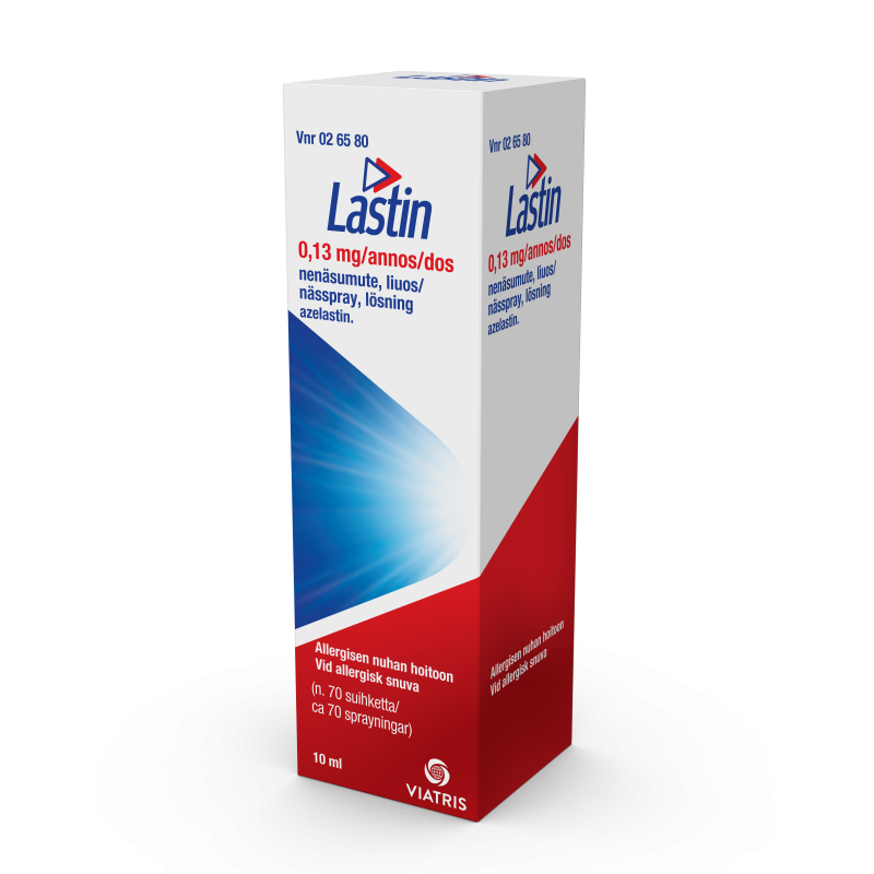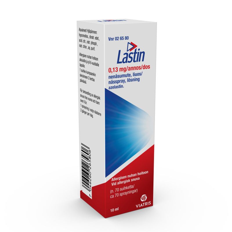 Lastin on nenäsumute, jonka vaikuttava aine on antihistamiinien ryhmään kuuluva atselastiini. Se helpottaa allergisen nuhan oireita, kuten vuotavaa tai tukkoista nenää ja aivastelua. Lastin ei sisällä kortisonia ja se auttaa jo 15 minuutissa. Alle 6-vuotiaille ja yli 6 kuukauden mittaiseen käyttöön vain lääkärin ohjeen mukaan.