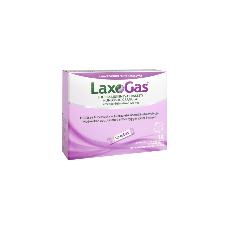 Laxogas helpottaa ruuansulatuskanavan epämukavia tuntemuksia kuten ilmavaivoja, liiallisia suolistokaasuja, röyhtäilyä, vatsan turvotusta sekä vatsan täysinäisyyden tunnetta. Laxogas-valmisteen sisältämä simetikoni vähentää suoliston kaasukuplien pintajännitystä, jolloin kuplat hajoavat tai sulautuvat yhteen ja kulkeutuvat helpommin pois suolistosta. Piparmintun makuiset rakeet otetaan ilman vettä ja ne liukenevat suuhun muutamassa sekunnissa. Laxogas-rakeet on pakattu annospusseihin, jotka on kätevä kuljettaa mukana. Laxogas on sokeriton, laktoositon ja gluteeniton.