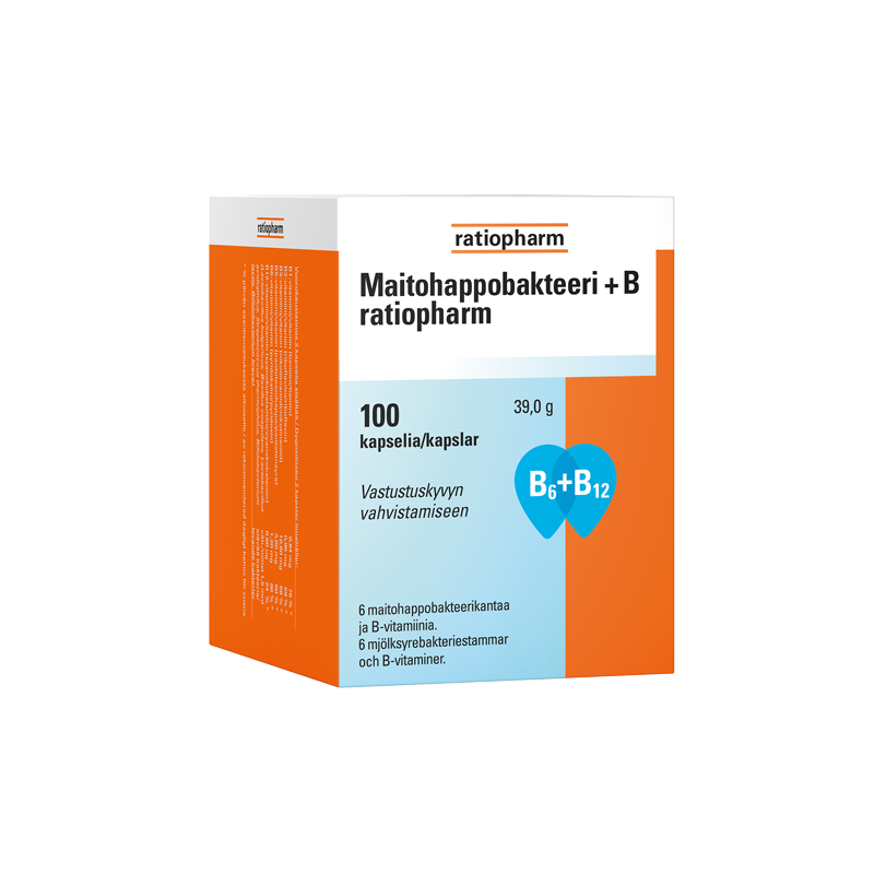 Maitohappobakteeri + B ratiopharm sisältää kuutta erilaista kylmäkuivattua, luonnollista maitohappobakteerikantaa sekä B-ryhmän vitamiineja( B1, B2, B3, B5, B6, B12). Tuote sopii lähes koko perheelle kouluikäisestä ylöspäin sekä raskaana oleville ja imettäville. Kouluikäisille lapsille ja vanhuksille, joille kapselin nieleminen voi olla vaikeaa, kapselin voi avata ja sisällön sekoittaa pieneen määrään nestettä tai ruokaa.