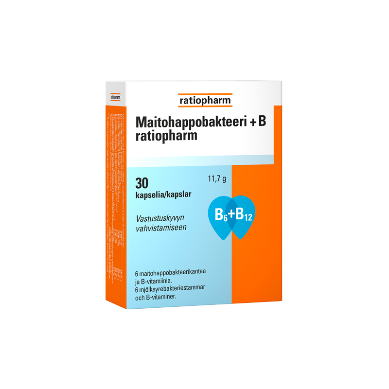 Maitohappobakteeri + B ratiopharm sisältää kuutta erilaista kylmäkuivattua, luonnollista maitohappobakteerikantaa sekä B-ryhmän vitamiineja( B1, B2, B3, B5, B6, B12). Tuote sopii lähes koko perheelle kouluikäisestä ylöspäin sekä raskaana oleville ja imettäville. Kouluikäisille lapsille ja vanhuksille, joille kapselin nieleminen voi olla vaikeaa, kapselin voi avata ja sisällön sekoittaa pieneen määrään nestettä tai ruokaa.