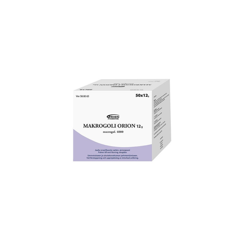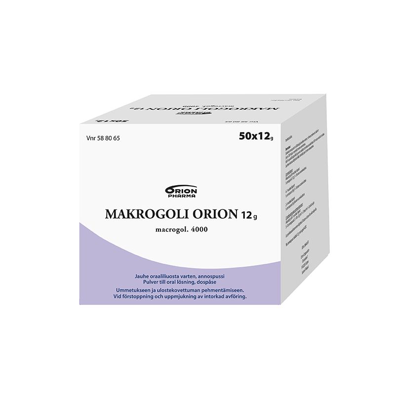 Makrogoli Orion 12 g jauhe oraaliliuosta varten on ummetuksen hoitoon sekä kuivuneen, suolessa pitkään olleen ulostemassan (ulostetukkeuma) pehmentämiseen tarkoitettu valmiste. Vaikuttava aine makrogoli 4000 sitoo vettä, jolloin suolen sisällön vesimäärä lisääntyy ja ulostemassa pehmentyy. 12 g annospussit soveltuvat aikuisille ja yli 8-vuotiaille lapsille. Pitkäikaiseen käyttöön lääkärin ohjeen mukaan.