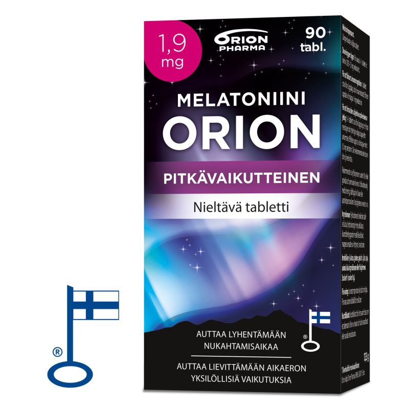 Melatoniini Orion. Melatoniini auttaa lyhentämään nukahtamisaikaa ja lievittämään aikaeron yksilöllisiä vaikutuksia. Pitkävaikutteinen nieltävä tabletti. Melatoniini Orion tuotesarjalla on avainlippu.