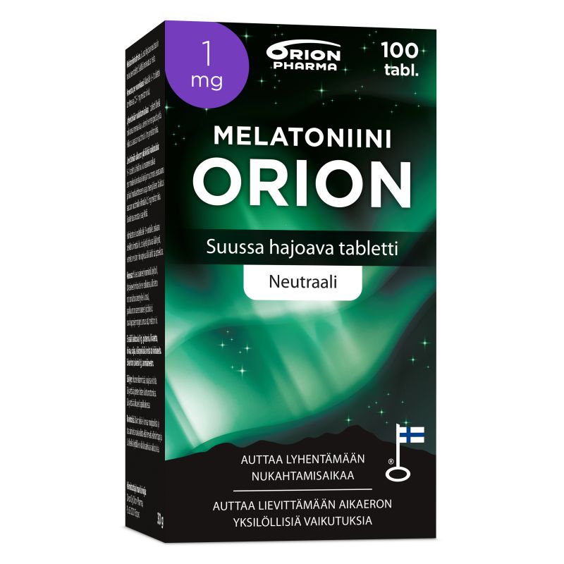 Melatoniini Orion. Melatoniini auttaa lyhentämään nukahtamisaikaa ja lievittämään aikaeron yksilöllisiä vaikutuksia. Nopeasti suussa hajoava tabletti voidaan ottaa kätevästi ilman nestettä. Makeutusaineina ksylitoli ja mannitoli. Neutraalinmakuinen eikä sisällä makuaromia.