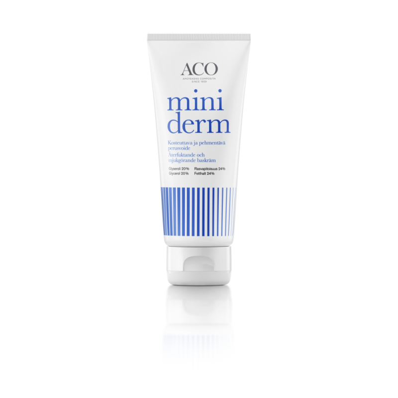 Miniderm on hellävarainen perusvoide, joka pehmentää, hoitaa ja kosteuttaa kuivaa ihoa. Sisältää 20 % glyserolia, joka sitoo kosteutta tehokkaasti ihoon. Miellyttävä käyttää, levittyy helposti ja imeytyy nopeasti. Hajusteeton.