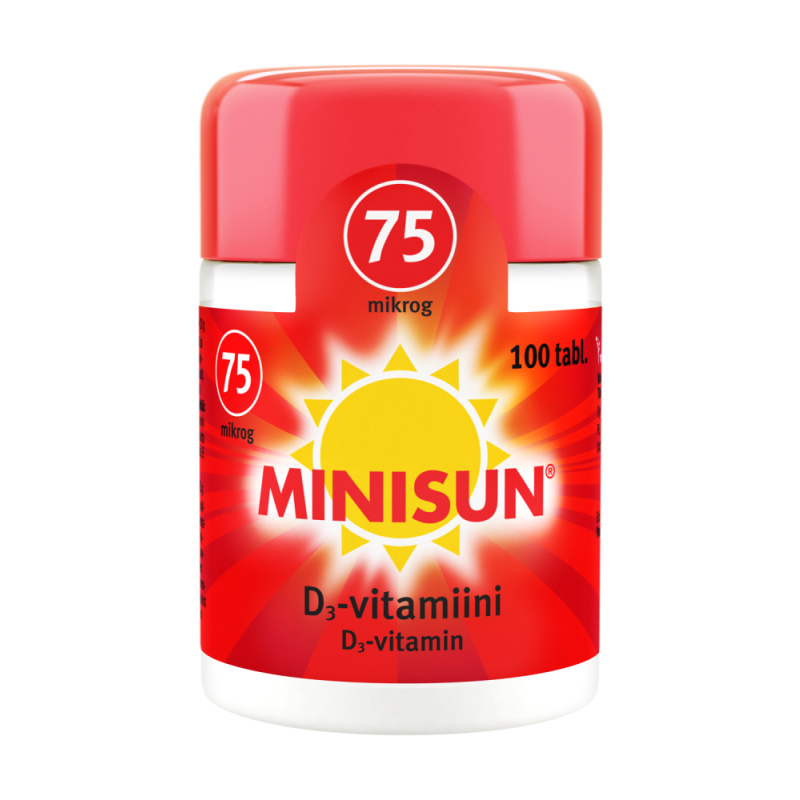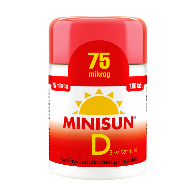 Suomessa kehitetyt Minisun D-vitamiinitabletit ovat helppo tapa varmistaa riittävä D-vitamiinin saanti ympäri vuoden. Minisun 75 mikrog sisältää tehokkaasti imeytyvää D3-vitamiinia. D-vitamiini vahvistaa vastustuskykyä sekä on tärkeä vitamiini luuston, lihasten ja hampaiden hyvinvoinnille. Annostelu on helppoa. Yksi pieni purutabletti päivässä riittää. Minisun 75 mikrog purutabletti on hyvän makuinen ja sopii nuorille, aikuisille ja ikääntyville tehostettuun päivittäiseen käyttöön. Ksylitolilla makeutetut tabletit voi imeskellä, pureskella, niellä tai murskata. Laktoositon, gluteeniton, hiivaton, soijaton ja liivatteeton.